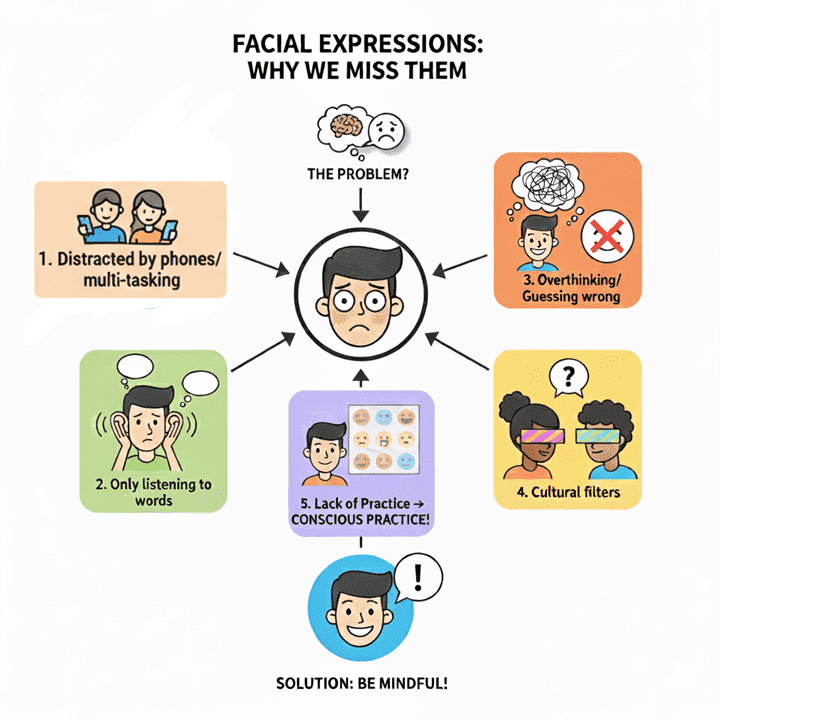 Facial expressions are natural, still people miss then. As per studies, people misses 70% of facial cues most of the time due to distractions, focusing only on words, overthinking, cultural filters, and simply because of lack of practice.